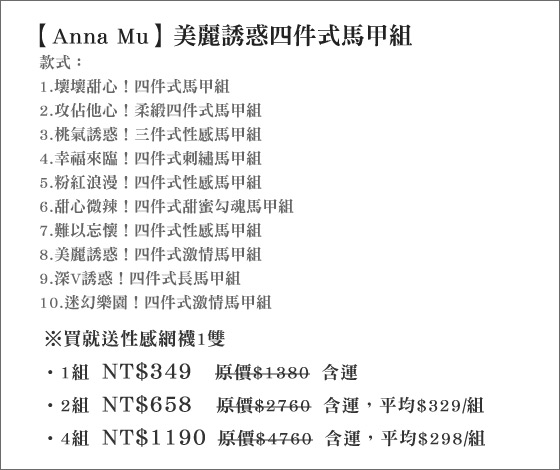 商品訊息簡述: 平均每組最低只要298元起(含運)即可帶回【Anna Mu】原價1380元美麗誘惑馬甲組1組/2組/4組,10款任選。買就送性感網襪1雙!